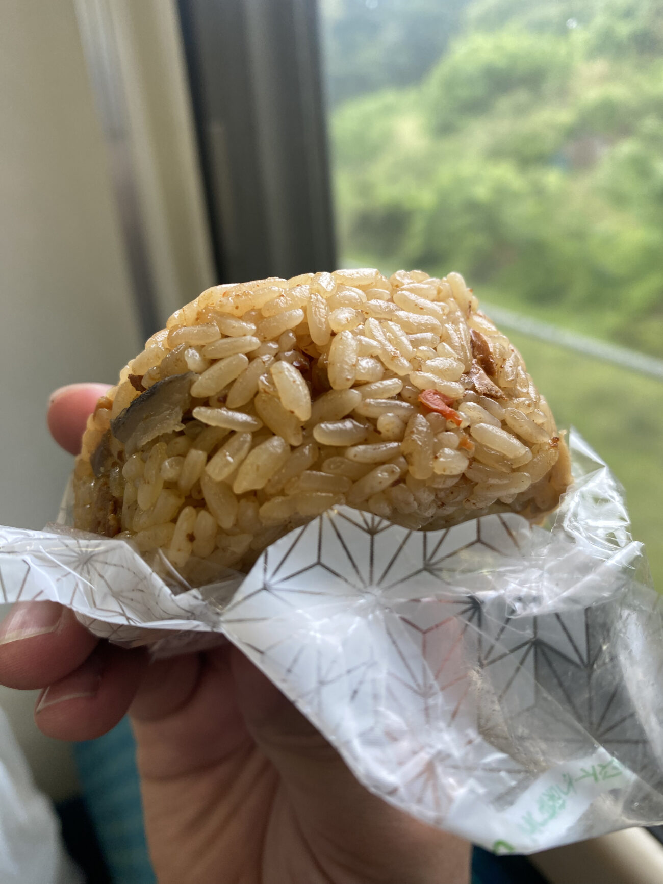 それにしても「ガタンゴトン」の音を聴き、山を見ながら食べるおこわ。めちゃ美味い…!笑