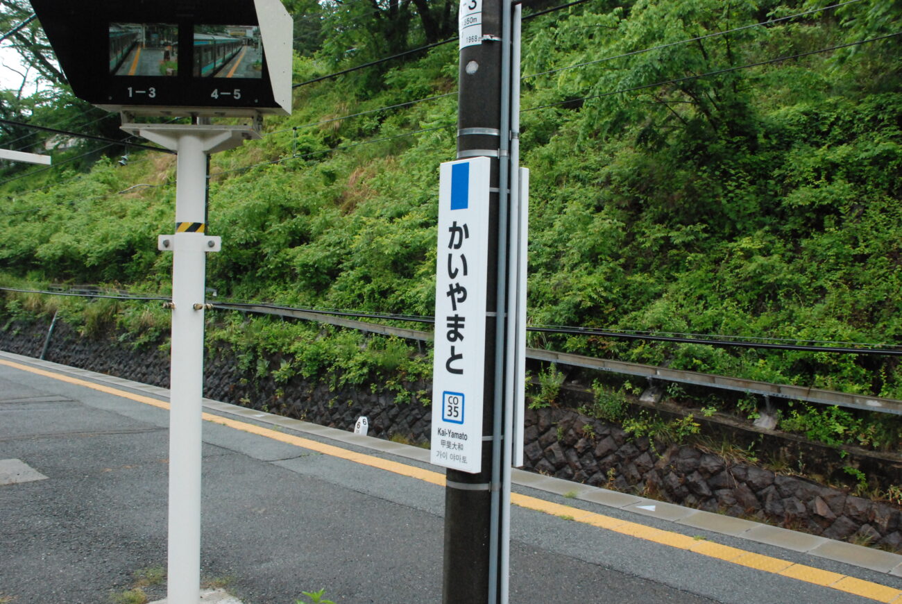 高尾を出て約1時間。甲斐大和駅に到着すると8分間停車し、特急電車に抜かれます。都内でもよく見かけるタイプのかっこいいやつ!この先、停車時間が長めに設定されているのは小淵沢と松本の2駅で各3分。後続に抜かれる停車駅はここ、甲斐大和駅のみ。それ以外の駅は原則待つ事なく発車していきます。