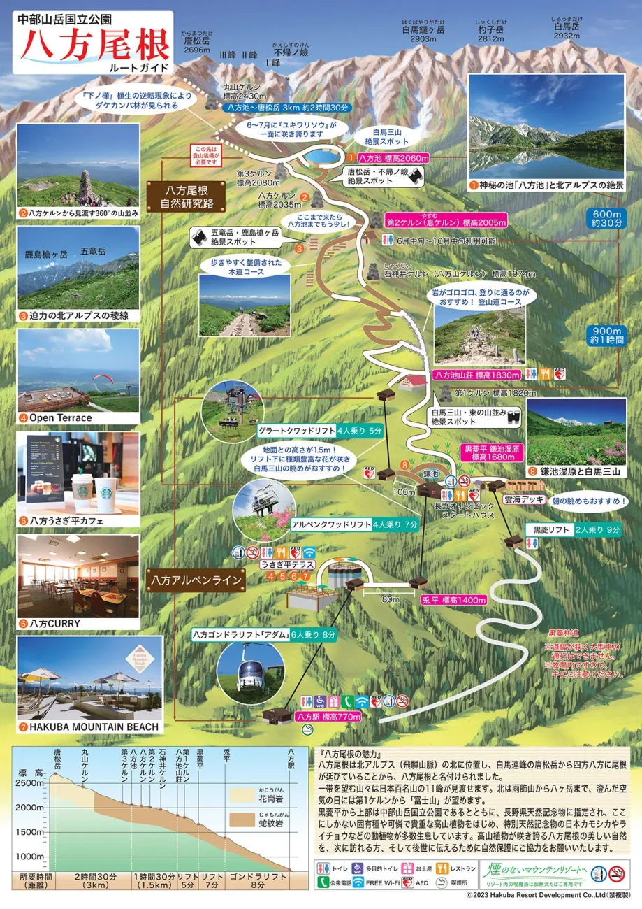 白馬八方池へ向かうには、まず白馬八方尾根スキー場へ。ここからゴンドラとリフトを乗り継ぐことで、標高1,830mに位置する「八方池山荘」まで一気に登ることができます。