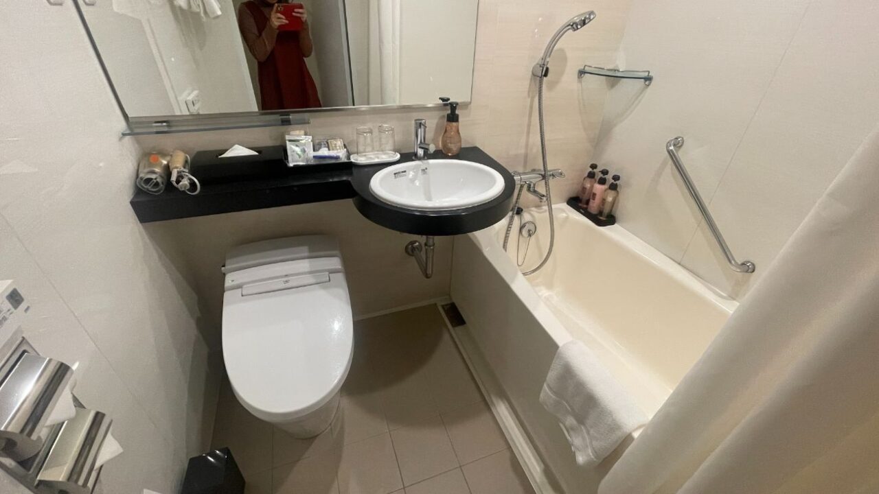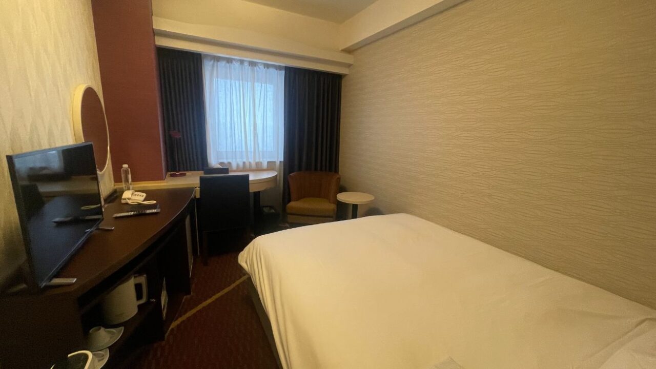 客室は広めで落ち着いた雰囲気があり、大きな窓からは松本の街並みやアルプスの山々を望めます。ベッドはシモンズ製で寝心地も抜群。バスルームには高級感あるアメニティも揃っていて、快適な滞在を約束してくれます。