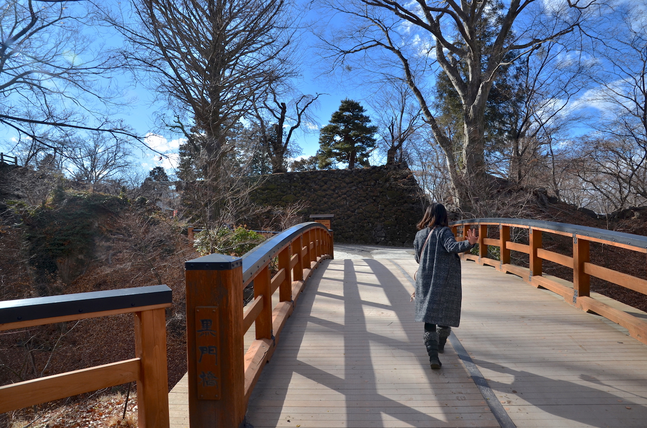 城下町より低い位置にお城があることから「穴城」と呼ばれる小諸城。水のない大きなお堀を渡ります。
