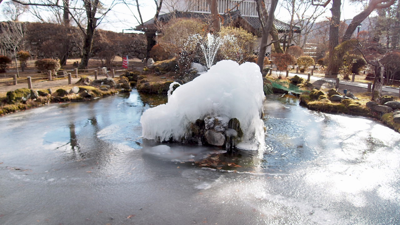 懐古神社をはじめとした小諸城址公園は、春には桜、秋には紅葉スポットとしても人気。氷漬けだった池も様相の異なる美しさを見せていました。