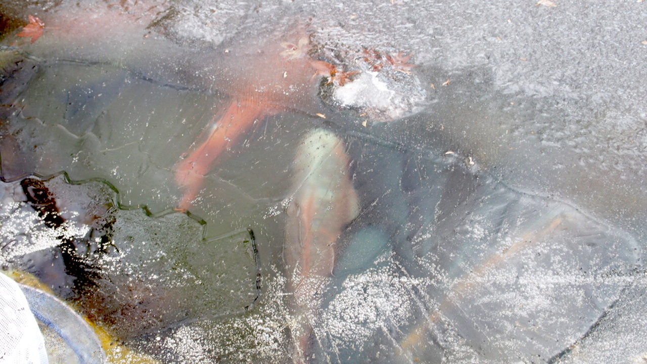 1月中旬、境内には凍った池。